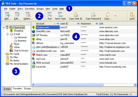 You can use the main menu (1) and buttons on the toolbar (2) to access commands and different program modules. Every password database file you created with TK8 Safe can have different folders and sub folders (3). Each folder can have unlimited amount of entries, which are seen in the entry list (4).